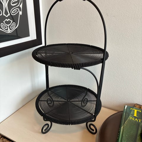 Fin opsats/etagere i metal med fire runde fade og bærehåndtag øverst. Har drejede detaljer på stangen og en tung fod, så den står stabilt på bordet. Synlig brugspor (se billedet).