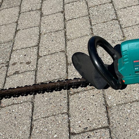 Bosch elektrisk hækkeklipper i grøn med langt sværd. Har ledning og original kasse med på billedet. Desuden en Bosch olie til at smøre sværdet.