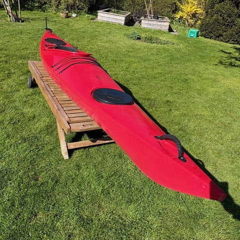 Rød Boréal Design Epsilon P200 havkajak med luger for og bag samt dæksliner til oppakning. Sæde og cockpit er komfortabelt udformet, og kajakken ligger stabilt i vandet.