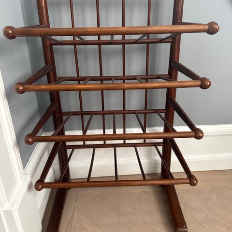 Smukt og dekorativt gammelt håndklædestativ / håndklædeholder i træ med elegant, klassisk udformning. Stativet er udført med drejede stænger og buede topstykker, som giver et let og raffineret udtryk – perfekt til både badeværelse, soveværelse eller som dekorativt element i en stilfuld indretning.