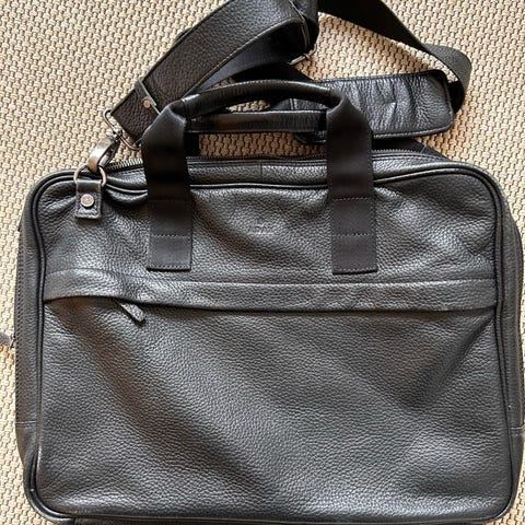 Saddler sort læder computertaske med både hank og justerbar skulderrem. Har lynlås, flere indvendige rum og foret inderside til fx laptop og papirer.
