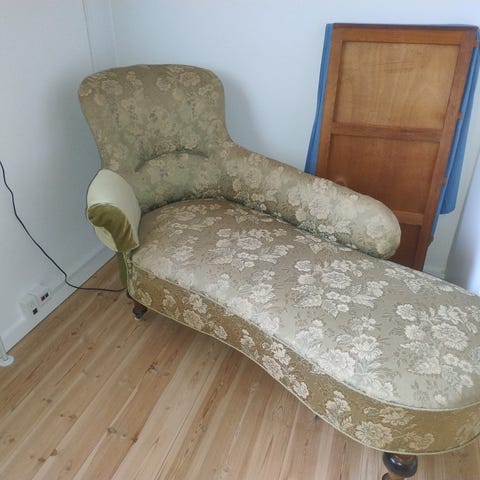 Antik chaiselong sofa med tilhørende 2 lænestole., Gammel chaiselong sofa med tilhørende 2 lænestole.