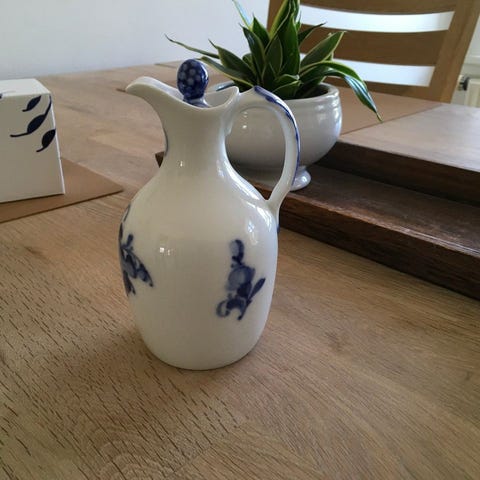 Blå blomst fløde kande nr 8026/10 og slukker skål 8142/10. Begge dele uden skål eller brugsspor.