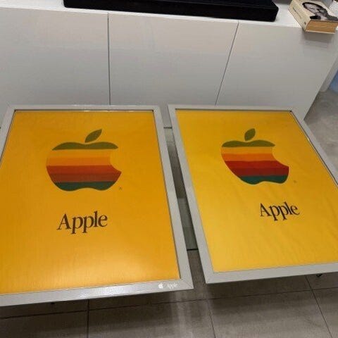 Reklameplakat, Steve Jobs, motiv: Apple, b: 60 h: 85, Se billeder for stand. Har desværre haft en vandskade i mit kælderum for nogle år siden, hvor denne desværre blev lidt ramt. Derfor vil man nogle steder på plakaten kunne se plamager, når man går helt tæt på.