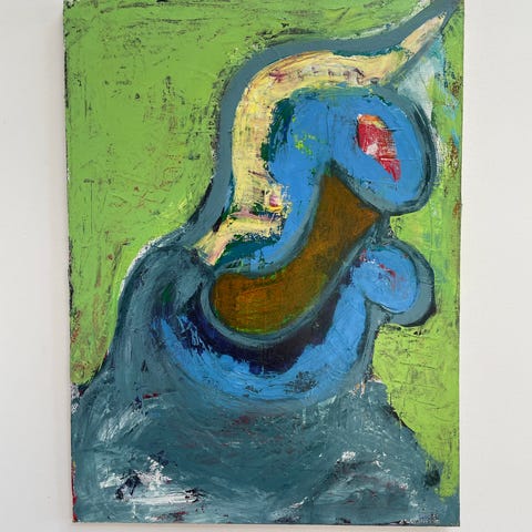 Farverigt abstrakt maleri på lærred med blå, rød, gul og pink nuancer. Maleriet har lodrette penselstrøg og flere lag maling, som giver et livligt udtryk på væggen.