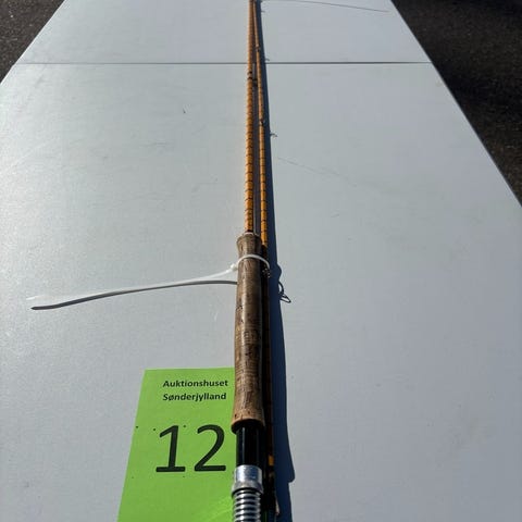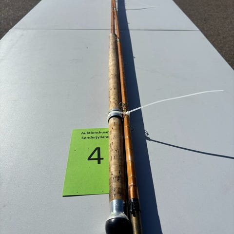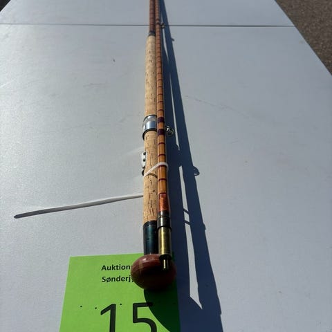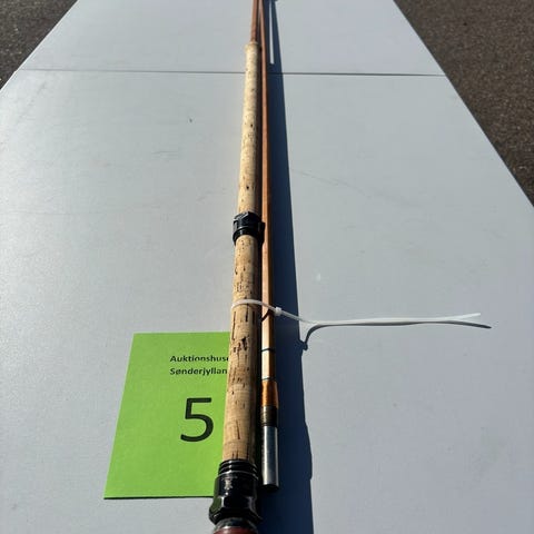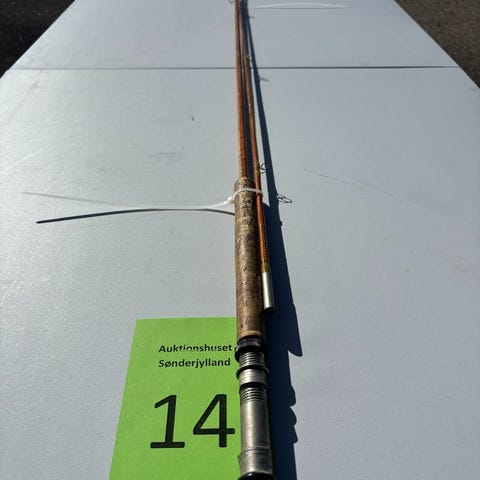 Klassisk ældre fiskestang i splitcane (bambus) med håndskrevne angivelser, bl.a. længde ca. 8½ ft. Fremstår i pæn stand. Fra dødsbo