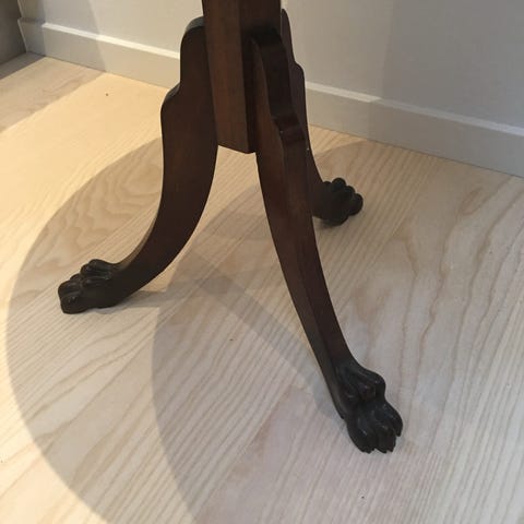 Fint ovalt Svensk bord i mørkt træ med drejet søjlefod og udskæringer fire buede ben. God størrelse står Stabilt på tæppe by eller trægulv.