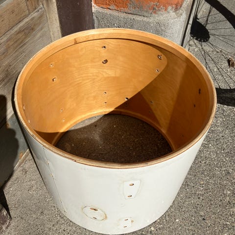 Det er jo konge da du kan gå amok med beslag ben osv, uden at skulle fylde huller ud. Har sansynligvis været brugt som march tromme så om du vil lave et 1930 jazz combo eller bruge den til tungmetal er dit valg.
