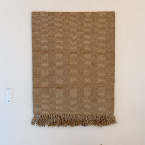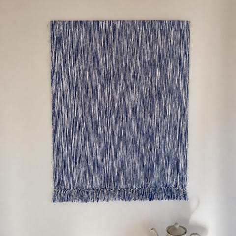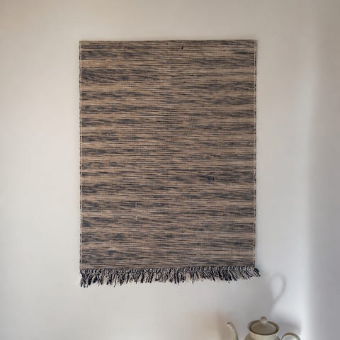 Håndvævet vægtæppe i genanvendt bomuld med brede striber i beige, flødefarvet og mørkeblå.