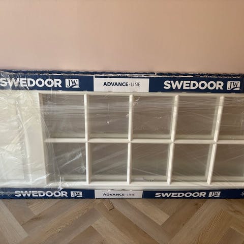 Swedoor Advance-Line glasdør i hvid sælges. Døren står stadig i emballage med plast rundt om og kan også bruges som skydedør da det er en såkalt stådør .