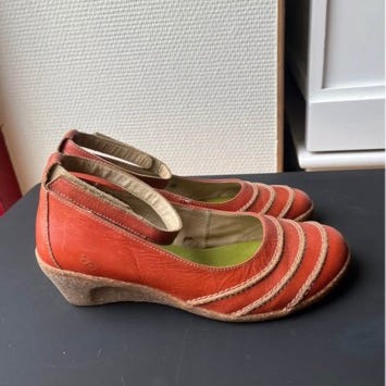 De har en overdel i flettet skind med hulmønster, indersål i lyst skind og brun gummisål (stiv) med en ca. 1 cm høj blokhæl.