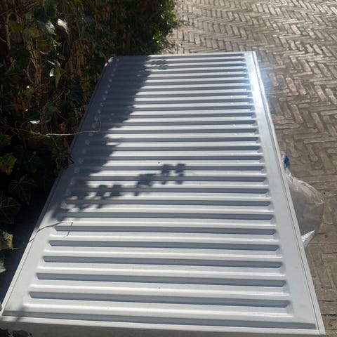 Hvid radiator med lodrette ribber sælges. Har tilslutning i siden og gitter i toppen til udluftning. 50cm