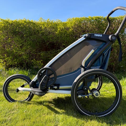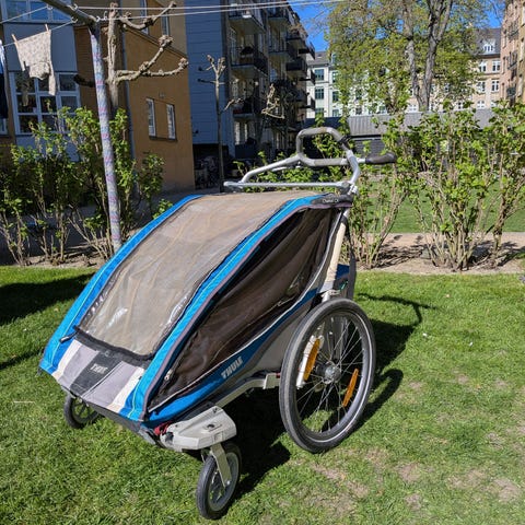 Den kan bruges kun som klapvogn for den mangler stangen som forbinder cykelanhængeren til cyklen.