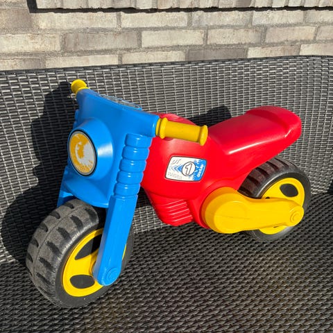 Fin trehjulet børnecykel/gåcykel med trailer bagpå. Perfekt til mindre børn, som elsker at køre rundt og have ting med i traileren.