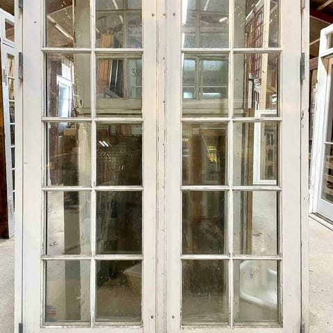 Antik, dobbelt terrassedør med fire store rudefelter i originalt, blæst glas. Døren åbner ud. Den gående dør er venstrehængt.