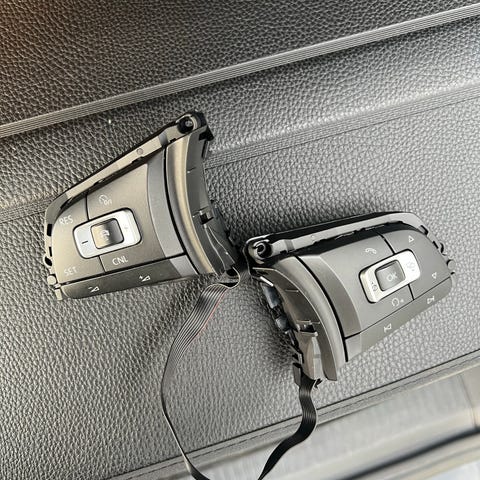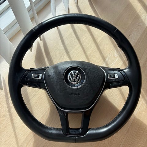 Volkswagen fladbunds rat med knapper til betjening i siderne paddel shift . Har glat sort overflade og center med VW-logo. Alt knapper virker.