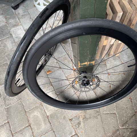 Hjul, Shimano Dura Ace, Shimano H-731 fornav på MA40 (guld) fælg (clincher) med trukne eger (36 stk). Første generations Dura Ace (1973-77) høj-flange nav med den originale QR. I perfekt stand og med meget lidt slidt på fælgsiden. Dækket er mest på for at beskytte fælgen, men følger med.