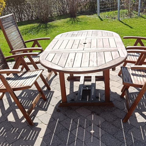 Møblerne har været godt vedligeholdt med en møbelolielak, og har været opbevaret tørt. Har enkelte skrammer, men er ellers pæne og i rigtig god stand. Ingen råd.