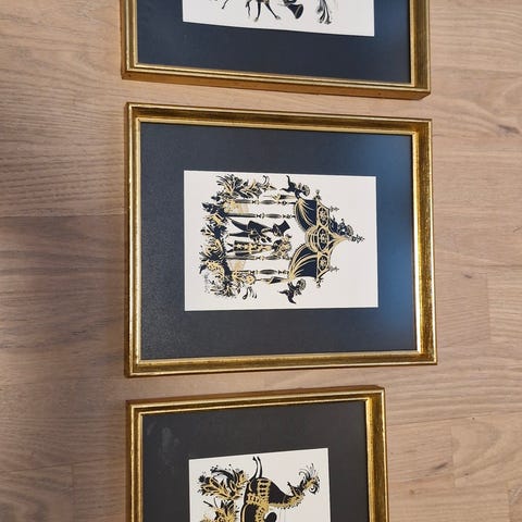 Rammer: To af billederne er monteret på plader, og det største er i en klassisk træramme.