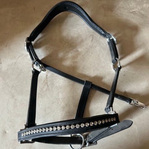 LeMieux grime med tyk beige fleecepolstring og justerbare spænder i siden. Har kraftige metalringe og sort rem under kæben helt ny aldrig brugt str pony