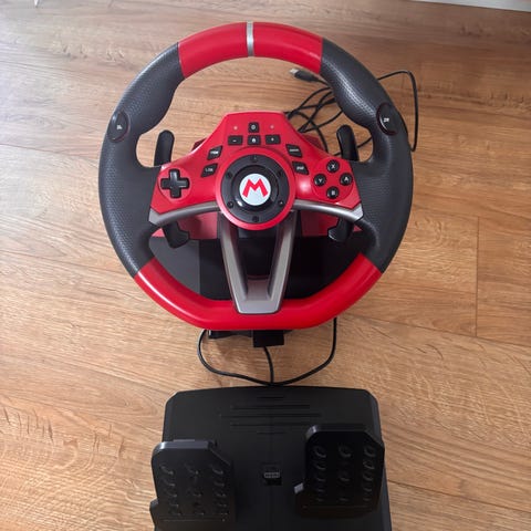Mario Kart rat med rødt design og flere knapper på fronten. Med separat pedal-enhed med to pedaler og ledning til tilslutning til konsol eller pc.