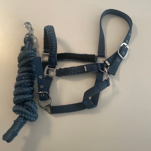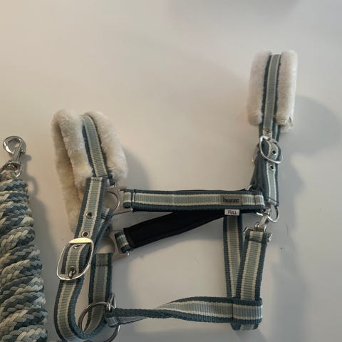 Lyseblå EQUES Superstar grime til hest med tekst på næsebåndet. Justerbar med spænder og ringe til fastgørelse