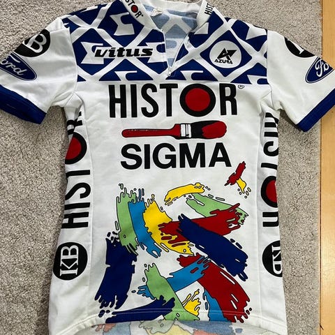 Castelli cykeltrøje i str M i hvid med blå mønster og lynlås foran. Har tre lommer bagpå og korte ærmer med tryk på