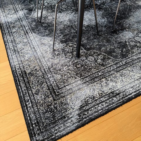 Lækkert RugVista tæppe i grå nuancer med et let slidt/meleret mønster. Har rektangulær form og passer godt under spisebord eller i stuen