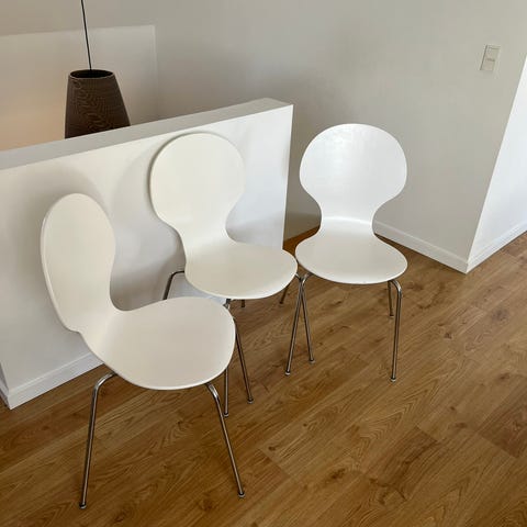 Langt de fleste af stolene (12-13 stk.) er i rigtig flot stand med pæne, blanke kromben. Der er et par stykker med lidt overfladerust på benene, og kun én enkelt der har en del. Alle skaller er intakte og pæne.