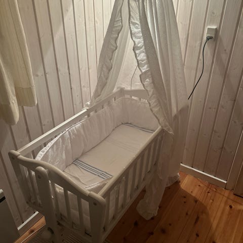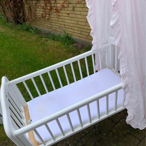 Vugge, Vugge med sengehimmel, Vugge med hvid sengehimmel og hvidt sengetøj