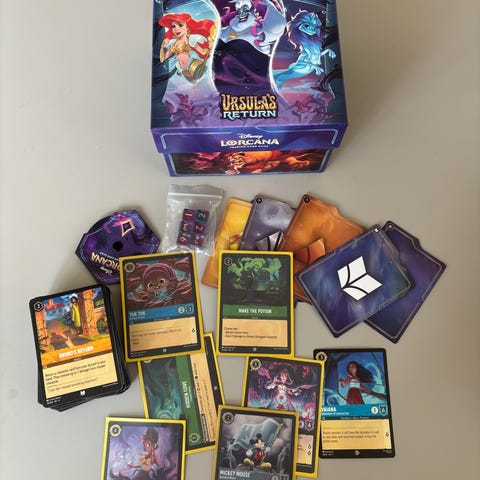 Disney Lorcana Illumineer’s Quest: Deep Trouble sæt med alt indholdet af kort og spillebrikker. Specialkort er lagt i lommer. Spillet med en gang. Ursulas deck er også sat i lomme. Der medfølger et Aladdin lommer, hvor der er brugt et par stykker.