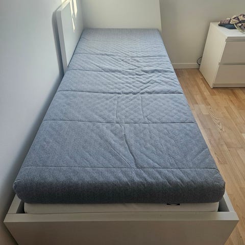 Seng med fin vedligeholdt madras. Sengegavlen kan både være højre og venstrevendt.