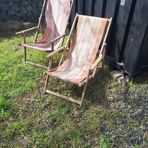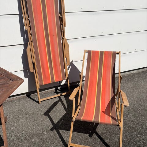 To sammenklappelige liggestole i træ med stribet stof i grøn, orange og gule nuancer. Begge har armlæn og kan justeres i ryglænet, så de er nemme at stille op på terrassen eller i haven.