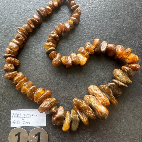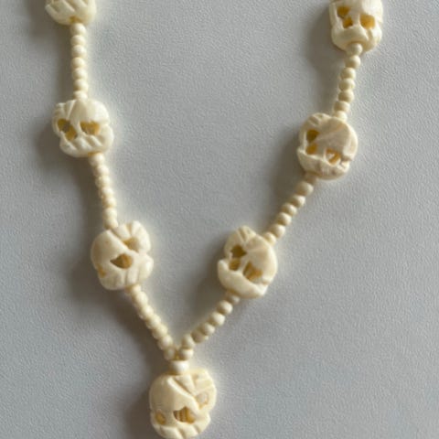Fin cremefarvet halskæde med udskårne perler og elefantvedhæng. Lukkes med lille metal-lås og har perler hele vejen rundt.