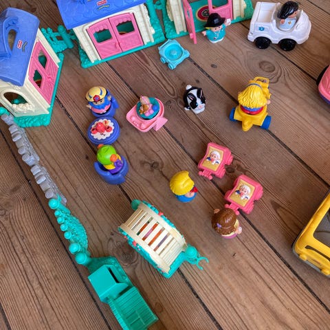 Fisher-Price Little People bondegård med flere dyr, figurer og hegn. Der er blandt andet staldbygninger, traktor med vogn og små dele som kan flyttes rundt i legen. Der er lyde i staldene