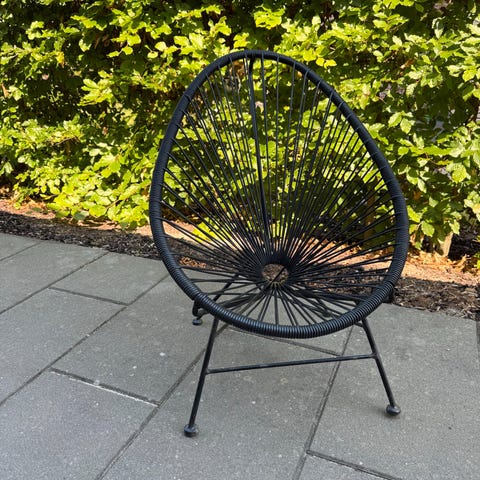 Sort rund loungestol med flettet plast og metalben, god til altan eller terrasse. Sædet er lavet af spændte snore, så den er let at flytte rundt på.
