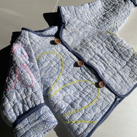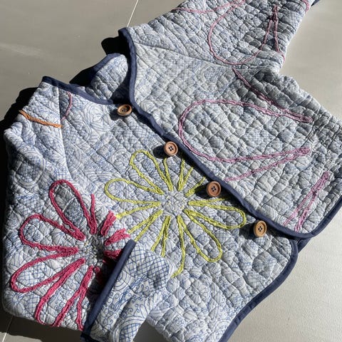 De er syet af nøje udvalgte quilttæpper, som er i god stand og i bomulds materiale. Tæpperne er renset inden syning, men der kan forekomme små misfarvninger.