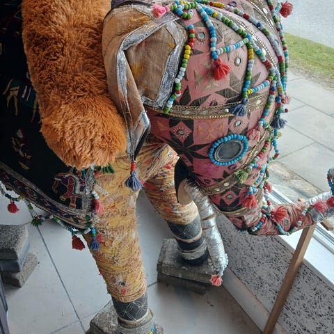 Stor elefant til væggen lavet i metal med lange stødtænder. Hænger flot ud fra væggen og giver et råt, skulpturelt udtryk.