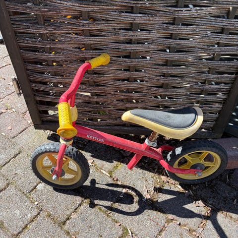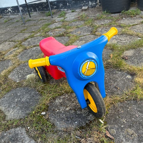 Lille politimotorcykel løbecykel til børn med brede hjul. God til at trille rundt på i haven eller indkørslen. Trænger til en våd klud.