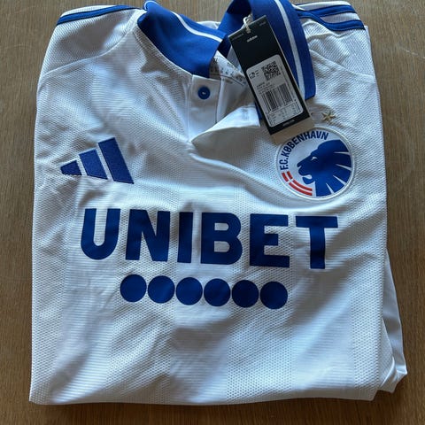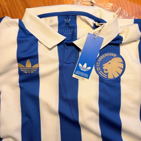 Adidas FCK fodboldtrøje i str L med brede blå og hvide striber. Har krave med knapper og klublogo på brystet.