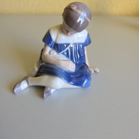 Figur i porcelæn med motiv af en siddende pige med armene løftet. Figuren er navngivet Op til mor. Nr. 2324