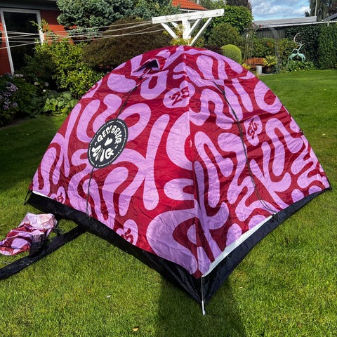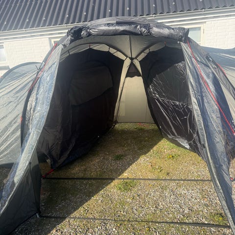 Stort blåt tunneltelt med flere separate sovekabiner og midtersektion. Har indgang med lynlås og barduner hele vejen rundt til at spænde teltet op.
