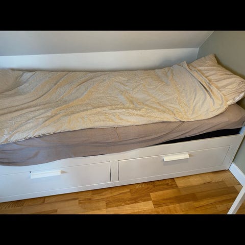 IKEA enkeltseng i gråt metal med madras. Enkel ramme med lige gavle, klar til ny ejer der kan bruge en simpel sengeløsning.