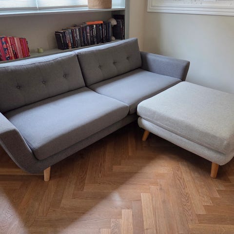 Sælger denne sofa med chaiselong (vendbar) Der er et lille bidemærker i hjørnet, men ellers fejler den ikke noget, kommer fra et røgfrit hjem, når den hentes er den usamlet.