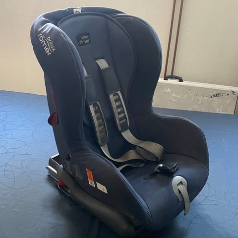 Britax Römer Max-Way autostol i blå/sort med 5-punktssele. Har justerbare seler og tydelige monteringsmærkater bagpå. Har aldrig været udsat for biluheld