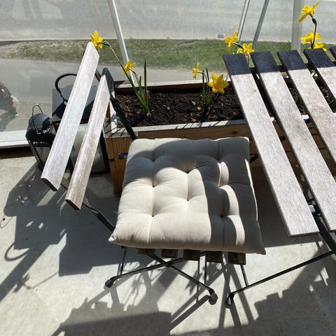 Blåt cafébord med 2 klapstole til altan/terrasse