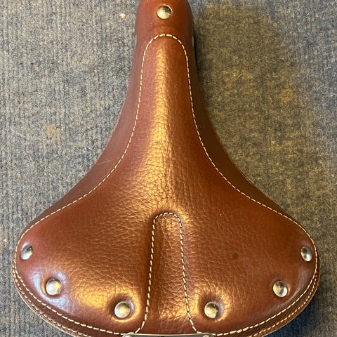 Brooks lædersadel med fjedre og klassisk brun overflade. Monteret på sadelpind med standard beslag, klar til at sætte på cyklen.