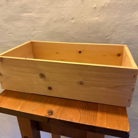 Træbakke i lyst træ med høje kanter. Samlet med skruer og dyvler, fin til fx at have stående på bord eller hylde.