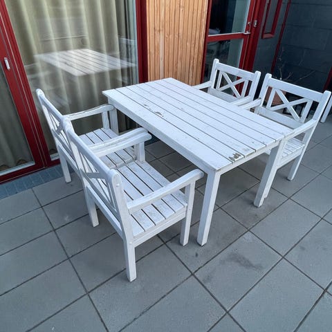 Sættet består af bord, bænk og 2 stole.