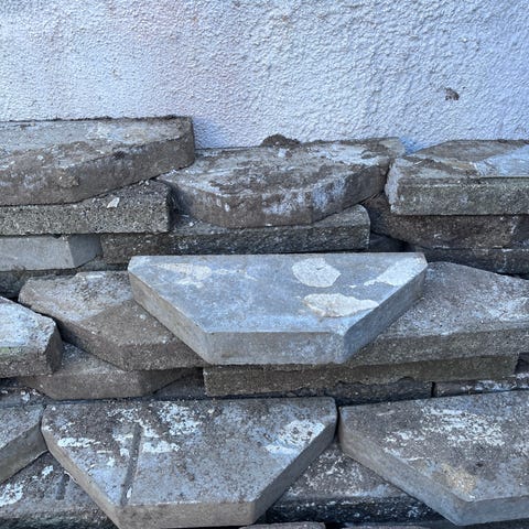 Bunke grå betonfliser i forskellige kant- og hjørneformer sælges samlet. Gode som kantsten eller til småprojekter i haven, fliserne ligger klar til afhentning.